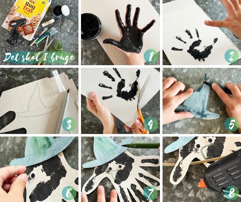 - Lim en kvist på som kost med limpistol og en pind til at holde heksen i Harlev